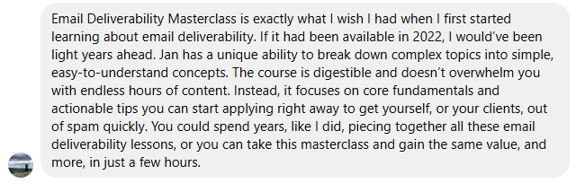 In the course, I will share the various methods that I have used to boost email deliverability for my clients.
